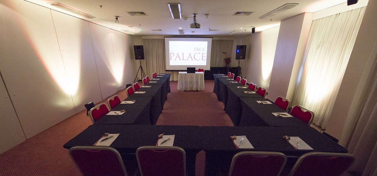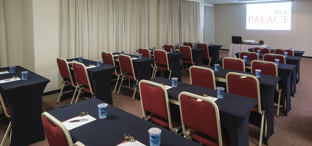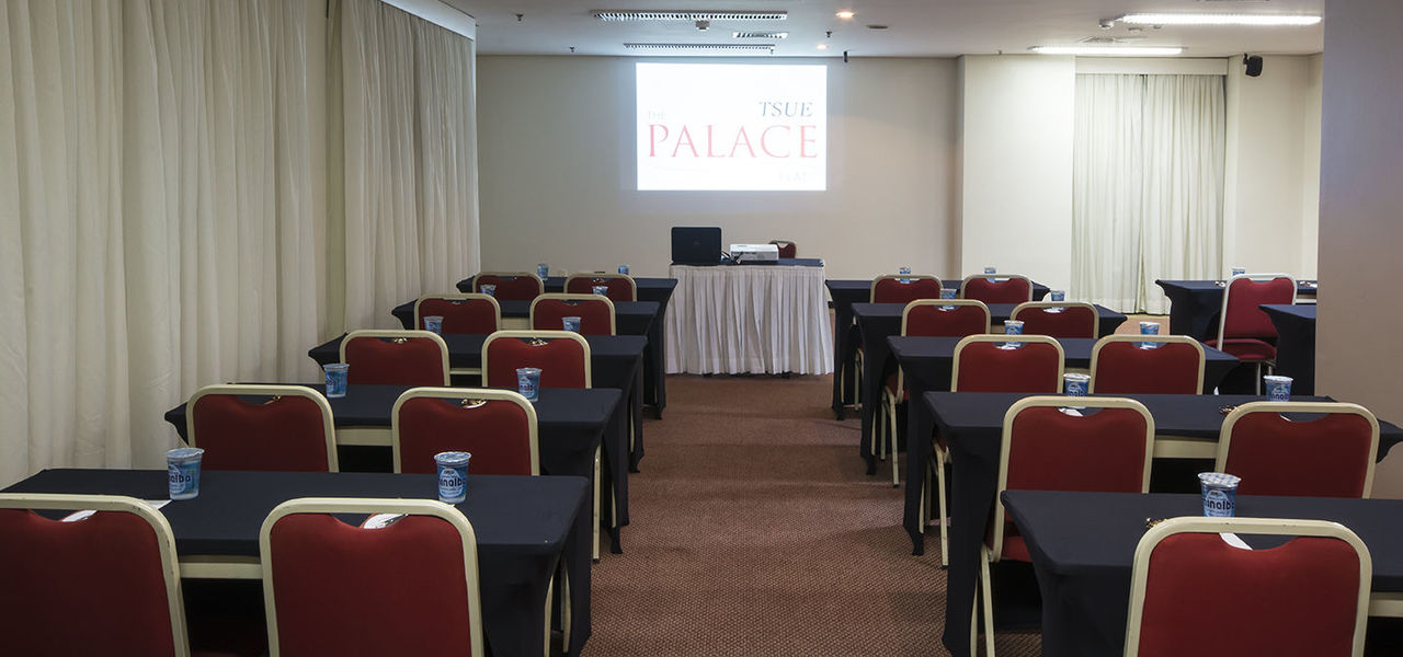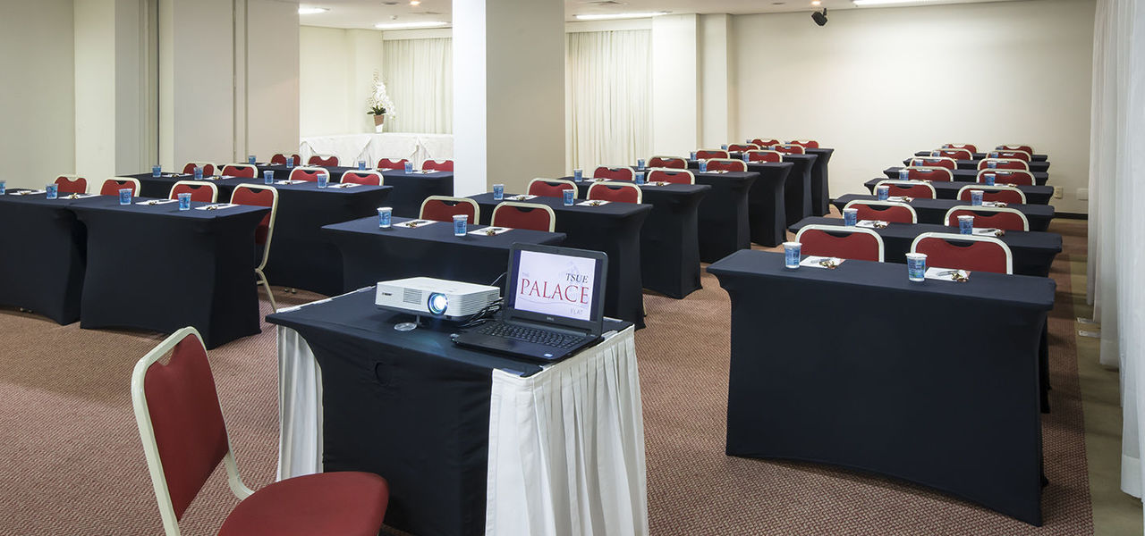O Tsue The Palace Flat oferece salas de eventos com capacidade para até 100 pessoas em formato auditório. Na maioria das salas dispomos de outros formatos de acordo com a necessidade do seu evento e uma estrutura que dispõe de equipamentos para apresentações de áudio, vídeo e computação (data show, tela de projeção, microfones com fio e sem fio, lapela, projetor de slides, TVs de vários tamanhos, equipamentos áudios-visuais, laser point, flip chart, notebook, entre outros).